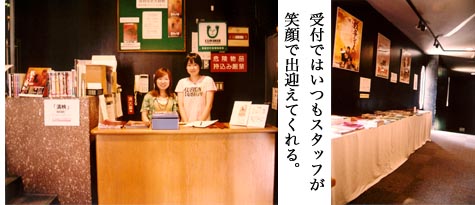 「埋もれた作品というのはプリントするコストも掛けられず、ずっと提供される会社に眠っていたものですから、フィルムが化学変化を起こして劣化している場合が多いのです。缶を開けたとたんに酸化した酢の匂いが部屋中に立ちこめて、換気したら外にまで匂いが漏れて、向いにお寿司屋さんがあるんですがそこの匂いと思った人もいたくらい…なんていうこともありましたからね」と今では笑い話のようなエピソードだが、現在でもフィルムの状態が悪い事はしばしばあり、映写技師の苦心は並々ならぬものがある。ただ、こうした映写技師泣かせのプリントは実は第一世代と呼ばれているプリントが多く、傷だらけであるにも関わらず画面の抜けが素晴らしく、ニュープリント版が再現出来ない画面の明るさやピンの光り方が素晴らしいという。「第一世代のモノクロ映画は老朽化して、いつか消えて行く運命ですから、こうしたフィルムに巡り会えた方はむしろラッキーなのです。(笑)是非、その違いを感じて頂きたい」と大矢氏は語る。 スタジアム式の場内は照明が抑えられ、非常に落ち着いた雰囲気を醸し出している。さすが演劇を上演しているだけに音の通りは抜群で、セリフの聞き易さはトップクラスといっても過言ではない。外観と同様、壁面を黒く塗られたロビーも心地良い重厚感に満ち溢れており、丸い窓からこぼれる外からの明かりが柔らかいコントラストを生み出している。また、空きスペースを埋め尽くすかのように置かれたチラシを収集するのも楽しみのひとつだ。入口の受付では特集上映の関連資料や関連グッズの販売を行っており、コアなファンの方向けの回数券もコチラで購入する事が出来る。元々、映画館で回数券を導入したのはコチラが最初で、特集によって異なるが40〜50本の上映を行う際は10、5、3回券を用意している他、特集期間は何度でも入場出来るフリーパスも発行している。 |